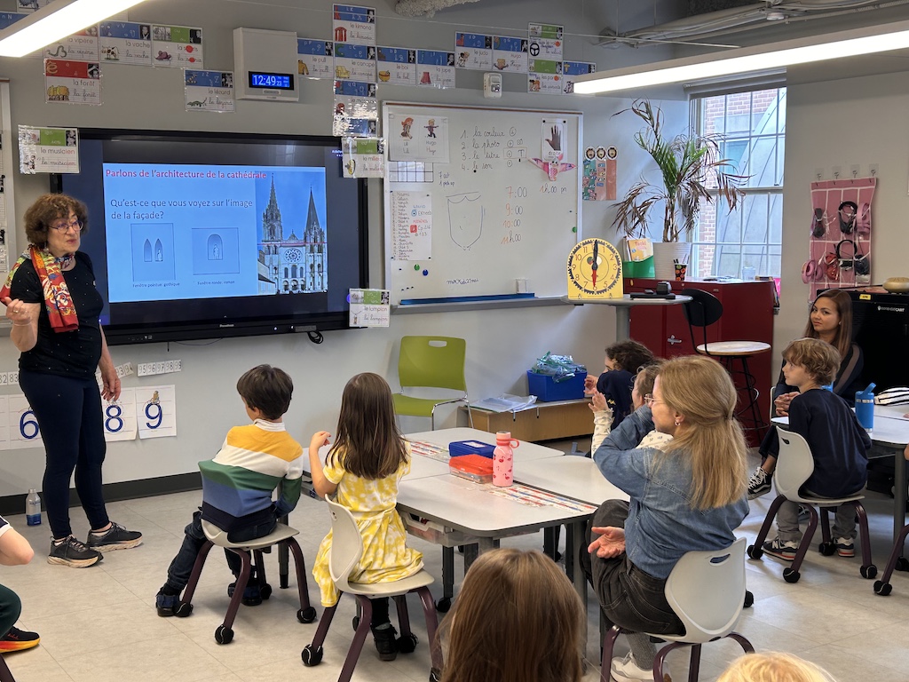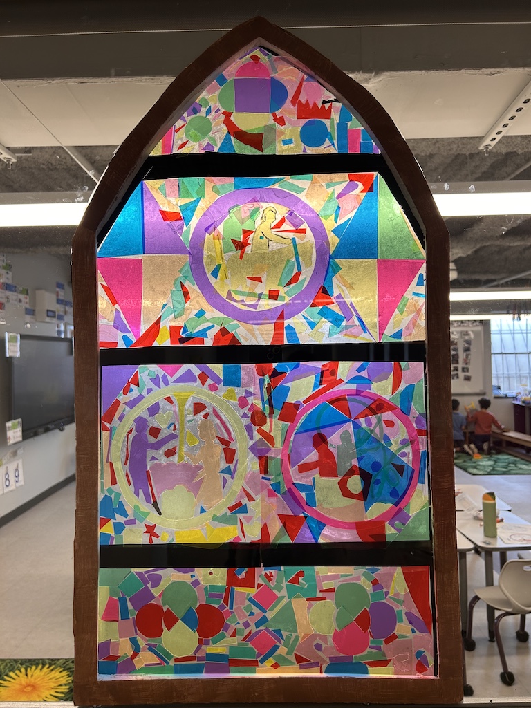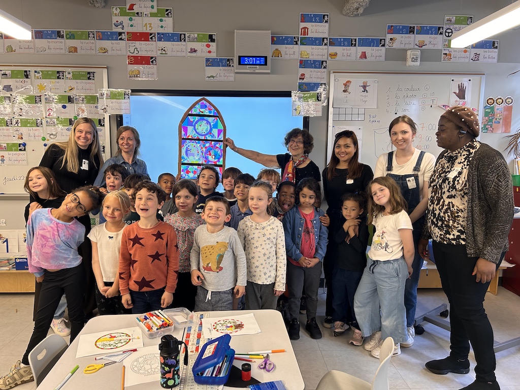 In May 2025, AFC worked with first graders at Lycée Rochambeau in Bethesda, MD, on a special project exploring stained glass at Chartres Cathedral. Students began with an interactive presentation about the history of the Cathedral and techniques of stained glass, connecting directly to their science and history curriculum. They then took part in a hands-on workshop where, in small groups, they recreated individual stained-glass panels using photographic colored paper. Once assembled, the student-made panels formed a single large collaborative artwork.
